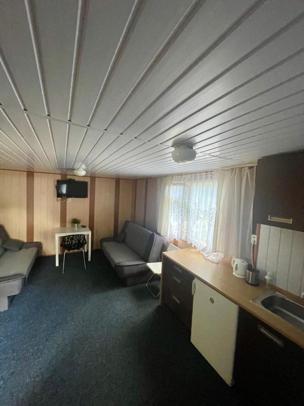 Domek z 2 sypialniami. Featuring a private entrance, this chalet is comprised of 1 living room, 1 separate bedroom and 1 bathroom with a walk-in shower. Guests will find a refrigerator and kitchenware in the kitchenette. The chalet also has a barbecue. This wheelchair accessible chalet features a tea and coffee maker, a seating area with a flat-screen TV and a shower chair. The unit offers 4 beds. Domek - 6 osobowy. Powierzchnia pokoju ok.: 40 mkw. ;