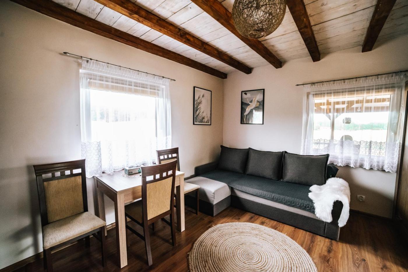 Domek z 2 sypialniami. This chalet offers a fireplace. Guests will find a refrigerator, kitchenware, a microwave and an electric kettle in the fully equipped kitchen. The chalet also provides guests with a barbecue. Featuring a terrace, this chalet also provides a washing machine, a private entrance and a flat-screen TV. The unit offers 4 beds. Domek - 6 osobowy. Powierzchnia pokoju ok.: 70 mkw.